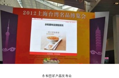 2012年4月5日,知名品牌永和豆?jié){赴上海世博展覽館參加2012臺灣名品博覽會。本次博覽會是由上海市人民政府、臺北世界貿(mào)易中心共同舉辦,博覽會為期4天。在上海展出前,2009年至今,臺灣名品博覽會3年來已陸續(xù)在大陸舉辦13場次,參觀的企業(yè)與民眾逾400萬人次。作為2012年臺灣名品展的重要一站,2012上海臺灣名品展倍受關(guān)注與期待。