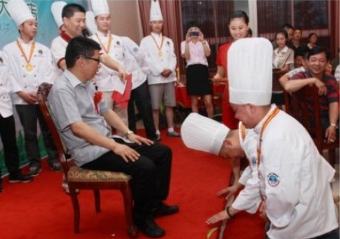7月10號晚,“當(dāng)代四大名廚”陳緒榮在湖北黃石陽新舉行了盛大的收徒儀式!收徒儀式由大冶市烹飪餐飲業(yè)協(xié)會常務(wù)副會長兼秘書長羅文主持,黃石市烹飪餐飲業(yè)協(xié)會和大冶市烹飪餐飲業(yè)協(xié)會的眾多嘉賓到場祝賀,北京、江西和武漢等地的弟子專程前來賀喜。首先,我號召同行承諾推廣綠色食材和綠色烹飪的“生態(tài)宴”,并在“食品安全低碳環(huán)保‘生態(tài)宴’”簽名墻上簽字,大家踴躍寫上自己的名字;隨后,收徒儀式以傳統(tǒng)的拜師形式舉行,按跪拜、敬茶、頒發(fā)證書和合影等程序進行;最后,嘉賓和弟子登臺發(fā)表致辭。