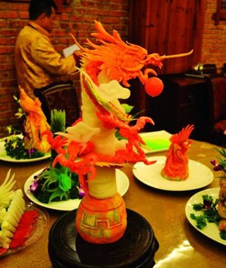 制作“中華龍”的涼菜名廚說(shuō),涼菜拼盤(pán)的制作過(guò)程,最考究的是廚師的藝術(shù)靈感和精湛、熟練的手工操作程度。自己從事廚師工作12年來(lái),所用于練習(xí)涼菜雕刻的蘿卜、南瓜、芋頭、萵筍等果蔬已達(dá)到3萬(wàn)多斤。