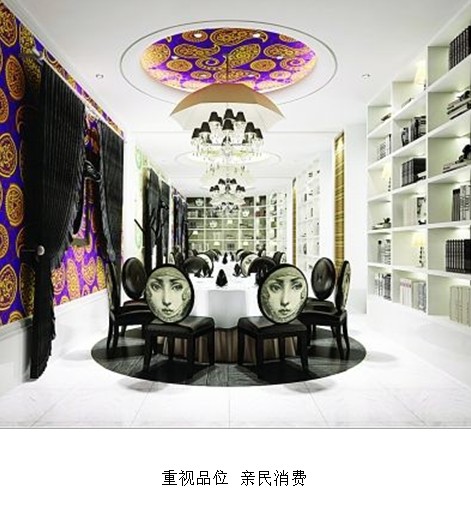 創(chuàng)意川湘菜餐廳呈現(xiàn)時尚、新潮的設計風格,店內家具均以白色皮革箱造型為主,透露出溫馨的歸屬感和留洋小資品位;整體色彩純凈,弧形墻體、剔透的鳥籠及觸手可及迎面撲來雅致的書櫥使空間富于流動和變化;天棚掛懸的小胖白天使裝飾物進一步豐富了視覺空間,卡座以及四周炫目的世界一線奢侈品牌的彩繪圖案,使得店內空間充滿了活力的跳躍感,彌漫著時尚青年向往的留洋生活氣息。