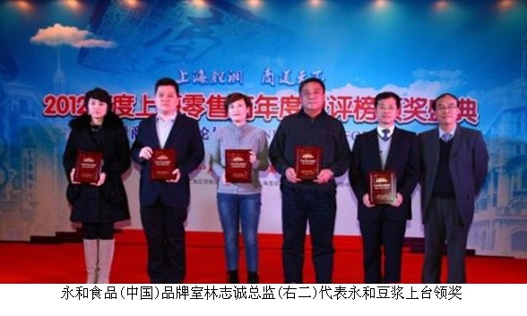 2013年1月8日,由解放日報報業(yè)集團下屬新聞晚報主辦,上海百貨商業(yè)行業(yè)協(xié)會、上海連鎖經營協(xié)會、上海購物中心協(xié)會協(xié)辦的商業(yè)精英論壇暨2012年上海零售商總評榜在外灘威斯汀酒店舉行。永和食品(中國)有限公司(商品名:永和豆?jié){)榮獲2012年度上海零售商“年度公益貢獻獎”榮譽。品牌公共事務室林志誠總監(jiān)代表企業(yè)赴會領獎。