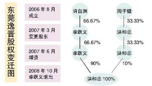 那么李躍義又是何時介入到東莞逸晉的呢?據(jù)東莞逸晉的公司決議,在2007年3月的一次股東會上,許自洲、周子健以原出資金額將手上的全部股權(quán)分別轉(zhuǎn)給了李躍義和洪和忠。轉(zhuǎn)讓后,李躍義獲得了許自洲手上的66.67%股權(quán)。隨即,公司章程也進(jìn)行了修改,李躍義擔(dān)任了公司唯一一名執(zhí)行董事、經(jīng)理和法定代表人。