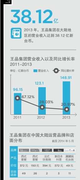 據(jù)王品集團(tuán)的財報, 2013財年,其在大陸的品牌門店營收達(dá)到7.7億元,較2012年的5.6億元相比,增長37.5%。