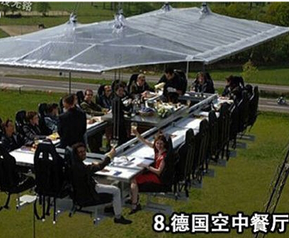 2008年8月25日,16名客人在離地50米高的“空中餐廳”享用一頓大餐。這個被叫做“空中餐廳”的項目是由一家德國探險體驗公司推出的,食客如果想要在這個被起重機懸吊起來的餐廳品嘗美味,每個人需要花費159歐元。而想試的朋友也不用跑到德國那么遠(yuǎn)去,最近在中國的上海也已經(jīng)有了這樣的“空中餐廳”了,大膽的你可以去挑戰(zhàn)一下了。