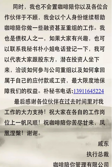 “咖啡陪你”欠2億巨款,執(zhí)行總裁辭職自曝8個月未領(lǐng)薪水