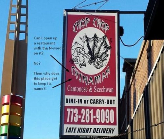 網(wǎng)友吐槽飯店名稱:“我能以N開頭那個(gè)詞(指Nigger,黑鬼)做餐館名嗎?”、“不能”、“那這家為什么可以叫中國佬?”
