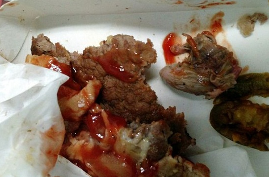 這名男子在墨西哥特萊內潘特拉市的一家麥當勞吃多汁漢堡,卻發(fā)現(xiàn)了讓人作嘔的東西。他拍照上傳到了網上,照片中能看到嚼碎的漢堡和一只支離破碎的頭。