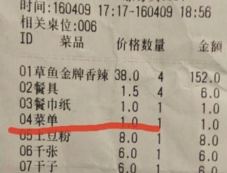 4月10日,江蘇省鎮(zhèn)江市市民馬先生到新開張的諸葛烤魚店吃飯,最后結(jié)賬的時候,收費清單上的“點菜單”費用,讓馬先生一家有些不高興。