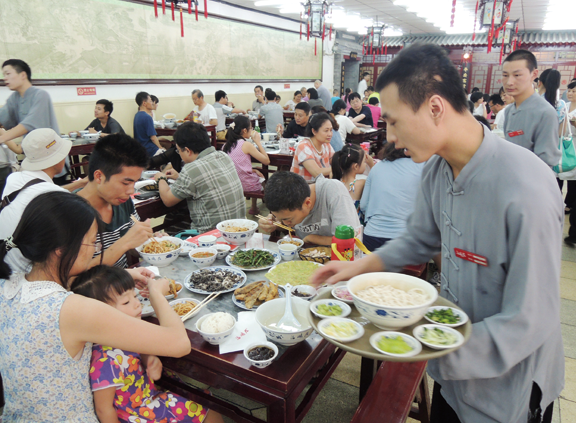“來了,您哪,幾位,里邊請”、“小二,倒茶”這樣的高喊聲從人們一進門就伴隨在耳邊,讓人一下子沉浸在老北京的市井文化中,隨之而來的便是穿對襟衣衫,蹬圓口黑布鞋、戴瓜皮帽、肩搭手巾把兒的小伙計,帶著顧客來到大理石的八仙桌前,落座在紅漆實木的長條凳上。觀賞著一幅長約16米的畫作《清明上河圖》,聆聽著京韻大鼓,不知道還以為自己在排古裝戲!吃好喝好后,又會在門童和小二“送客、走好、您哪”的喊聲中愉快地離開。不過,與韻味十足的老北京氛圍不同的、能讓人回到現(xiàn)實的,是前臺的電腦軟件結賬系統(tǒng)和寬敞明亮的就餐大廳,向人們傳遞著現(xiàn)代科技與生活流行色交織在一起的飲食時尚。