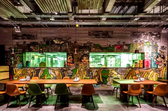成名于香港的梁經(jīng)倫自然不會錯過這個有意思的“罪惡據(jù)點”。Daimon Bistro的入口是一扇深褐色的鐵門,從曖昧的紫色燈光開始,破舊的木板墻、模仿腳手架搭起的竹吧臺、陳舊的電表、半開放式廚房外的涂鴉墻,連客人的衣帽間都被設(shè)在鐵網(wǎng)區(qū)域內(nèi)……每個細(xì)節(jié)似乎都是九龍城寨的縮影。