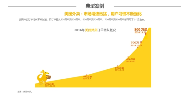近日,美團點評數據研究院發(fā)布《2016中國外賣O2O行業(yè)洞察報告》。報告顯示,在政策鼓勵、消費升級、技術發(fā)展、用戶習慣養(yǎng)成等諸多有利因素的助推下,2016年外賣O2O業(yè)務獲得高速發(fā)展,用戶量持續(xù)增長、發(fā)展空間充裕,僅美團外賣日訂單量就已超過800萬單。