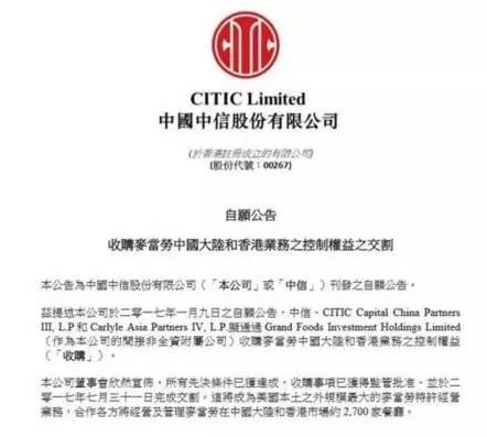 根據(jù)此前麥當(dāng)勞公布的協(xié)議,中信集團(tuán)旗下的中信股份、中信資本控股、凱雷投資集團(tuán)和麥當(dāng)勞聯(lián)合宣布達(dá)成戰(zhàn)略合作并成立新公司,新公司將以最高20.8億美元的總對價(jià)收購麥當(dāng)勞在中國內(nèi)地和香港的業(yè)務(wù)。中信集團(tuán)旗下中信股份和中信資本在新公司中將持有共52%的控股權(quán),凱雷和麥當(dāng)勞分別持有28%和20%的股權(quán)。