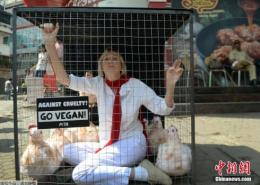 女子把自己關在籠中 抗議快餐店虐殺動物