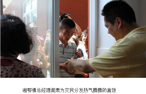 湘鄂情總經(jīng)理?肅親自帶著配餐車,趕到救災(zāi)現(xiàn)場,向群眾分發(fā)盒飯。他表示,湘鄂情做為首家在A股上市的民營餐飲企業(yè),向災(zāi)區(qū)人民奉獻愛心,是履行上市公司的企業(yè)社會責(zé)任,投身社會公益事業(yè)將是湘鄂情堅守的核心價值和長遠追求。