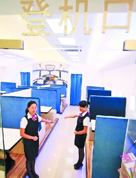 “歡迎登機(jī)!”一進(jìn)入餐廳,你就能看到服務(wù)員彎著腰,做出歡迎的手勢(shì)!拔覀兊姆⻊(wù)員都是參考空姐的標(biāo)準(zhǔn)來招收,要求身高160cm以上,長(zhǎng)相清秀,笑容甜美等!秉S慧玲介紹說,服務(wù)員統(tǒng)一著空姐制服,上班前還得接受餐飲禮儀和空姐服務(wù)方面的培訓(xùn)。