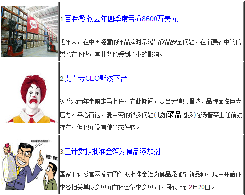 [摘要] 百勝集團(tuán)公布第四季度財(cái)報(bào)虧損巨大,麥當(dāng)勞CEO黯然下臺。春節(jié)近了,衛(wèi)計(jì)委擬批準(zhǔn)金箔為食品添加劑,因?yàn)闊嶙h。