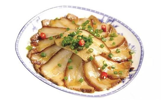 大致做法:1、帶皮五花肉刮洗干凈,改成大方塊,冷水下鍋焯透,撈出晾干。2、將晾好的五花肉抹上一層老抽,再次晾干之后入六成熱油炸至上色,撈出后投入五香醬湯中,小火鹵3小時,撈出晾至溫?zé)釙r,包上保鮮膜定型,放涼備用。3、客人點菜后取醬肉切片,碼入墊蔥絲的盤中,淋上少許東古一品鮮醬油,入蒸箱蒸3分鐘,撒蔥花即可上桌