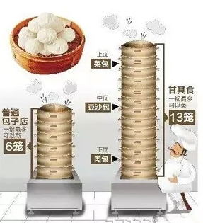 在甘其食,每個人都會看到壘得很高的蒸籠,如果細心一點你會發(fā)現(xiàn),其他包子店,頂多只能壘6層,不是不想多蒸幾籠提高效率,而是再高就熟不了了。甘其食最高能夠達到13層,“從9層到10層再到13層,這個是經(jīng)過了多少次試驗、重新定制蒸鍋等設備才能達到的!蓖瘑⑷A說,不光如此,下面幾層以下只能蒸肉包,中間幾層蒸豆沙包等都是有白紙黑字規(guī)定的,最上面只能蒸青菜香菇包!罢舭邮怯兄v究的,肉是生的,青菜香菇是半熟的,一定要同時熟才行。”