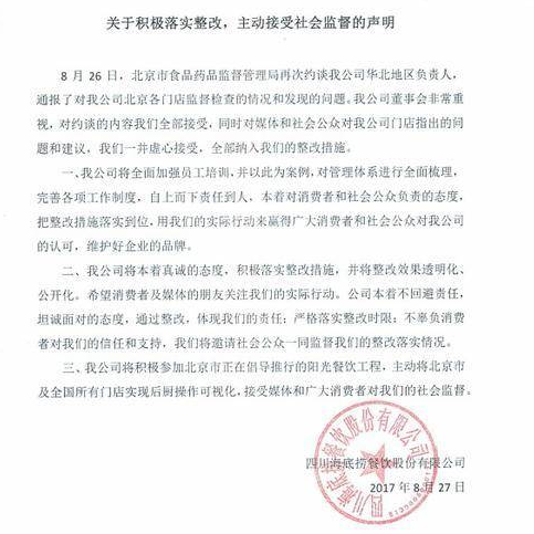 海底撈再發(fā)聲明:鍋我背、錯我改、請廣大民眾監(jiān)督