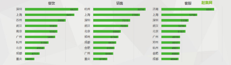 從薪資方面來看,深圳餐飲企業(yè)為95后應(yīng)屆畢業(yè)生提供的平均薪資水平最高,平均達(dá)6623元。其次是上海和蘇州分別為6431元和5998元。銷售類人才的薪資水平方面,杭州、上海、深圳排在前三位,分別為8074元、7795元和7315元。客服類人才薪資,濟(jì)南以6591元明顯高于其他城市,上海和深圳以5759元和5338元分列第二、第三位。一線城市的客服類人才需求量雖然逐年下降,但是因?yàn)楫?dāng)?shù)匦劫Y水平的差異,一線城市客服類薪資仍保持在較高水平。城市與薪酬,一直是求職者求職的的主要考量因素。做好職業(yè)規(guī)劃,根據(jù)職業(yè)目標(biāo)來選擇相應(yīng)的城市與崗位,十分重要。